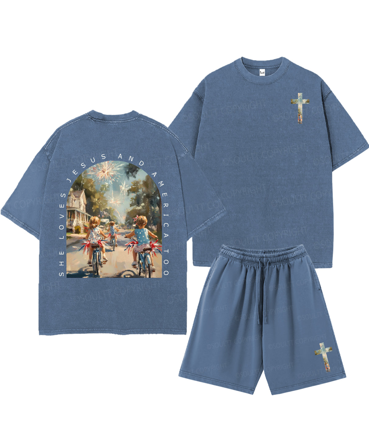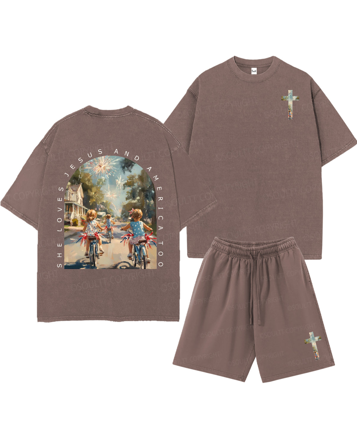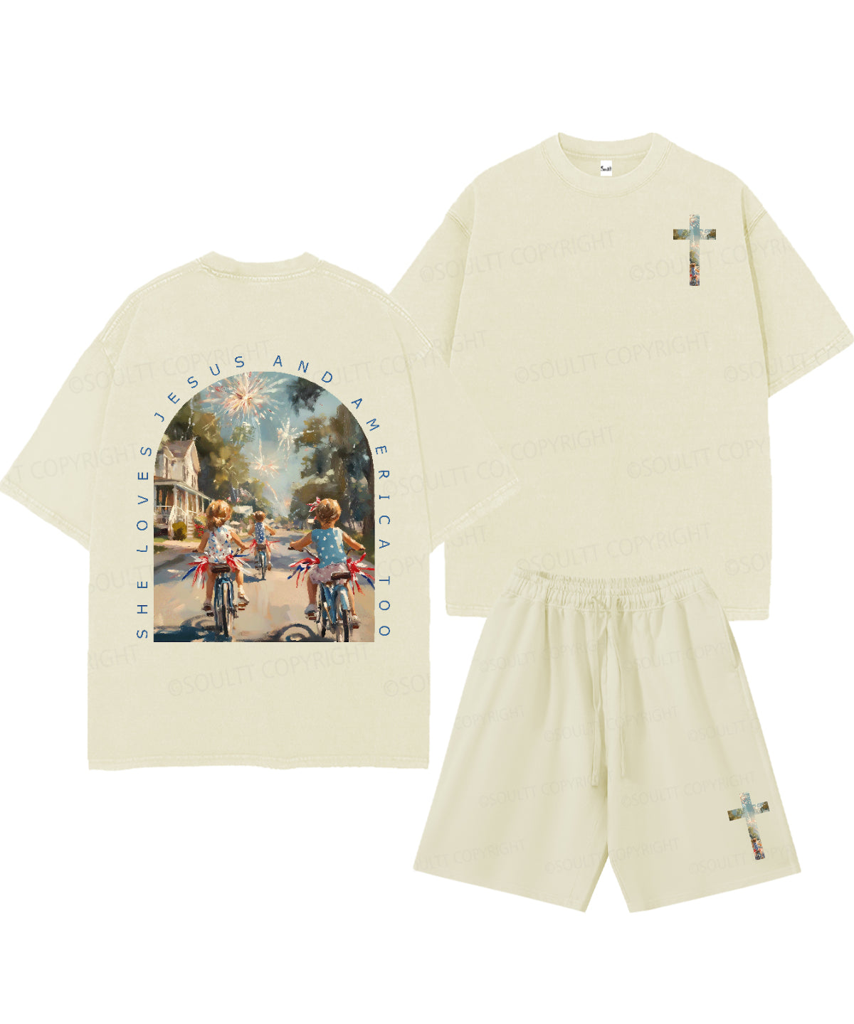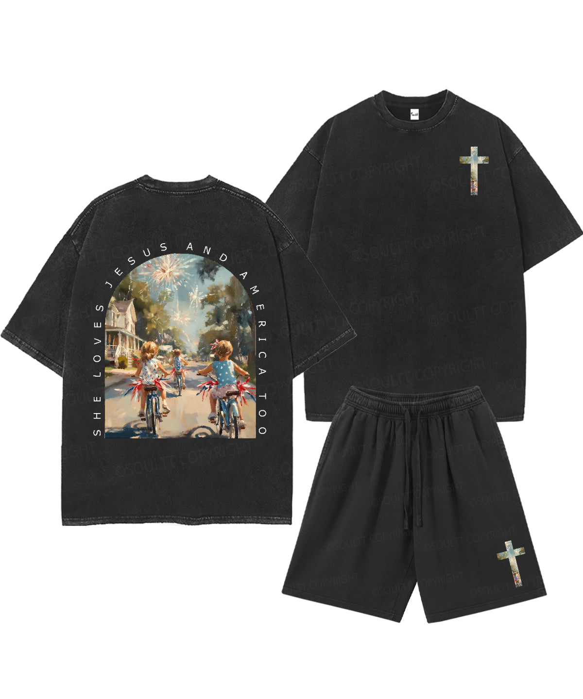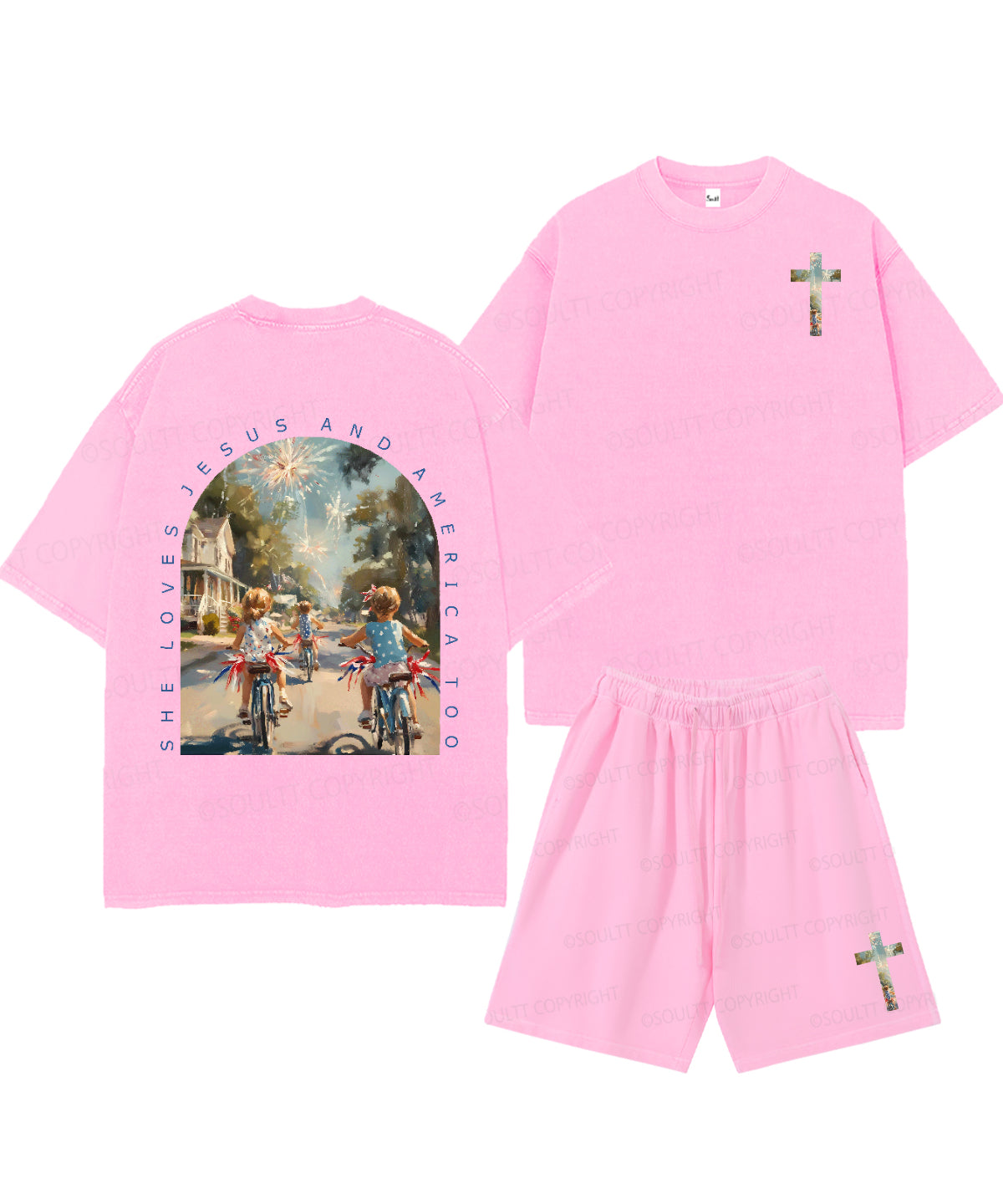 She Loves Jesus And America Too Double Sided Unisex Christian Washed T-Shirt & Shorts