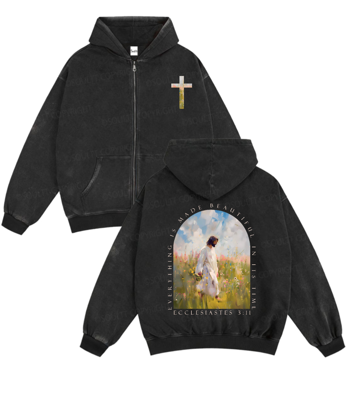 Everything Is Made Beautiful In It's Time Double Sided Washed Christian Zip-Up Hoodie