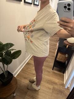 A note on sizing: if you’re between sizes, definitely go with the smaller one. I first ordered a medium because I wanted it to be slightly oversized, but it ended up being very oversized—more like a sleep shirt. I reordered several in a small, and the small still fits comfortably loose. If you want a fitted T I think it would be hard for this style, but you would need to size down by two sizes. For reference, I’m 5'9", 145 lbs, a size 6 dress, and a 34C bra. I also typically wear a size small in comfort colors t-shirts if I want it to be more tailored appearing and a size medium if I want it to be a little more breathable. This size small fits like a comfort colors size medium if not bigger. :)