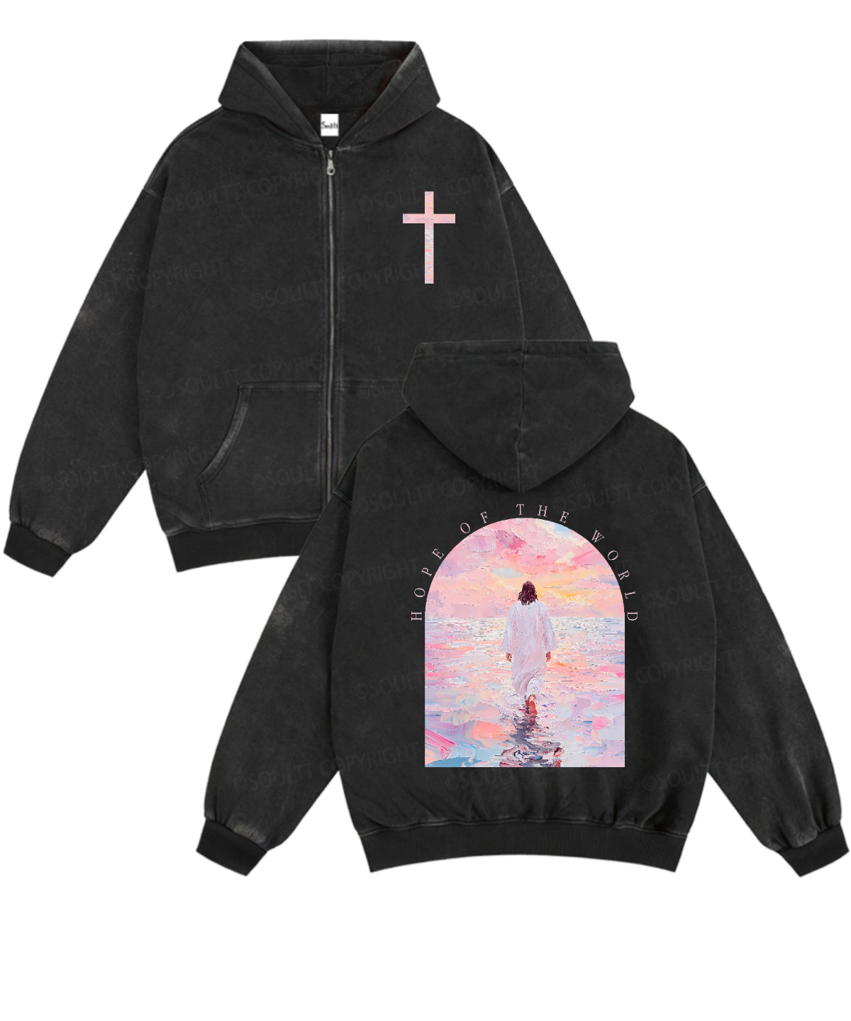 Hope Of The World Double Sided Washed Christian Zip-Up Hoodie