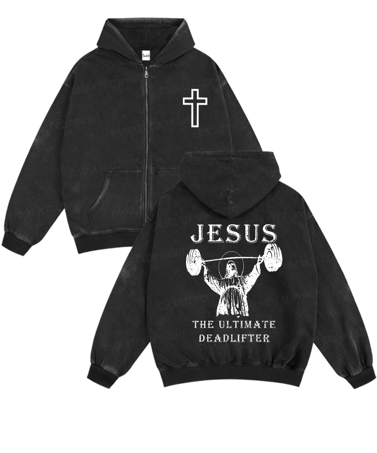 Jesus The Ultimate Deadlifter Double Sided Washed Christian Zip-Up Hoodie