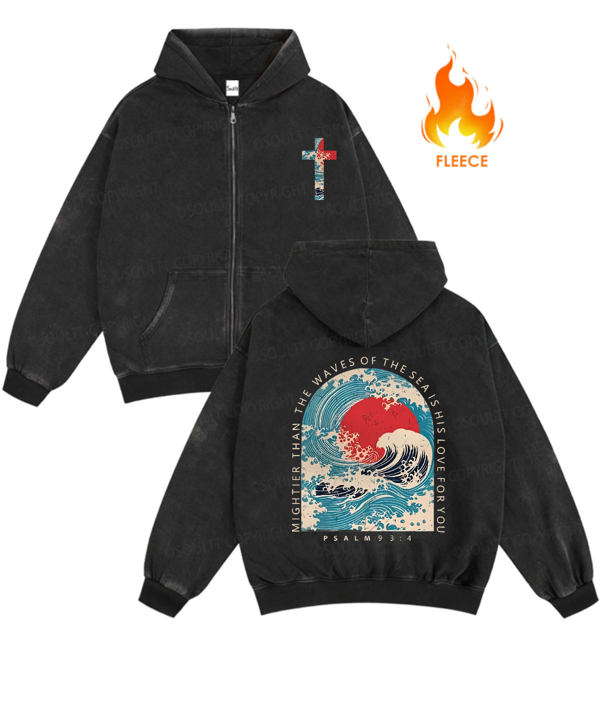 Mightier Than The Waves Of The Sea Is His Love For You Double Sided Washed Zip-Up Fleece Hoodie
