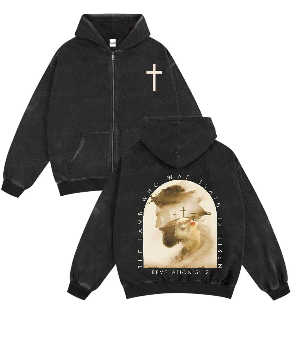 The Lamb Who Was Slain Is Risen Double Sided Washed Christian Zip-Up Hoodie